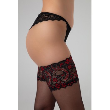 Luxurious Garter Stockings made of fine 15 denier quality, finished with a wide lace band. The flowe..