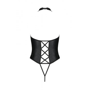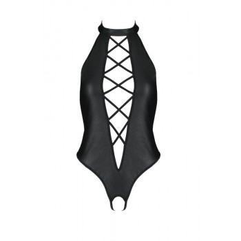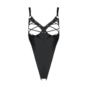 Imitation leather body with open cups and strap details. Tough and playful. With open crotch and sil..